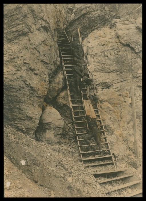 Gruppo di militari impegnato a calare una bara contenente i resti di salme di caduti della Grande Guerra, lungo una scala in legno costruita a ridosso di una parete rocciosa dalla forte pendenza. Stando alla didascalia sul verso della foto, si tratta del percorso di accesso ad un osservatorio in zona di combattimento