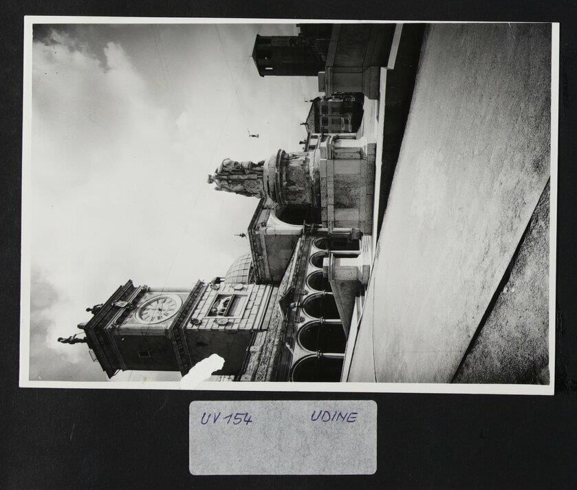Udine: veduta di uno scorcio di piazza Libertà. Al centro, il monumento alla Pace (in riferimento al Trattato di Campoformido) di Giovanni Battista Comolli (trasportato a Udine nel 1819). In secondo piano, la Loggia di San Giovanni, in cui si innesta la Torre dell'Orologio, di Giovanni da Udine (1527). In cima alla Torre, i due Mori e, in mezzo a loro, una campana. Sullo sfondo a destra, il campanile del duomo (prima metà del Duecento).