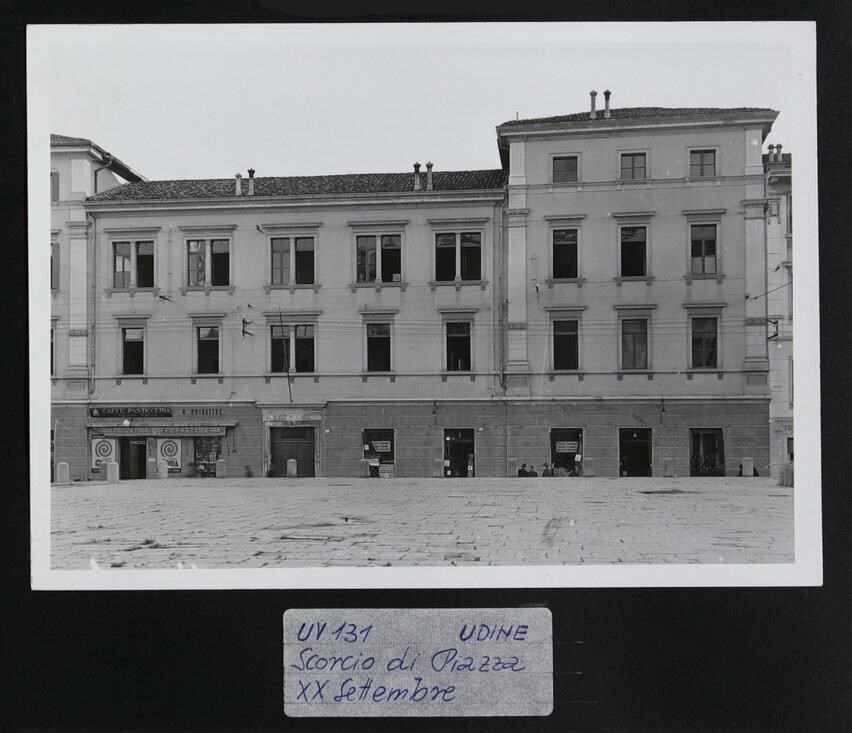 Udine, piazza XX Settembre (chiamata un tempo "piazza dei grani"): palazzo e, in basso a sinistra, un caffè pasticceria.
