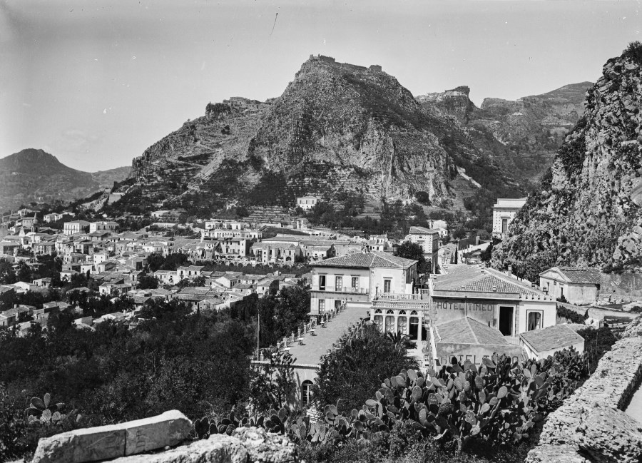 Scorcio panoramico di Taormina, dell'Hotel Timeo in primo piano assieme alle piante rigogliose di fichi d'india, degli edifici della città e delle montagne e dei ruderi del Castello di Mola.