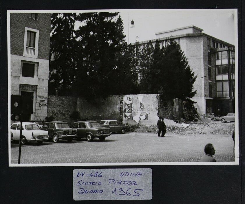 Udine, piazza del Duomo: a sinistra, la taverna/bar Duomo. Al centro, dei manifesti strappati.