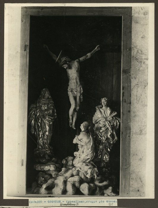 Riproduzione fotografica di un gruppo scultoreo composto da un Crocefisso e tre pie donne conservato presso la Chiesa di San Leonardo a Orgnese di Cavasso Nuovo.