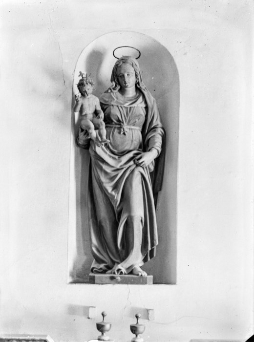 Riproduzione fotografica di una statua di "Madonna con Bambino" inserita in una nicchia nella parete, probabilmente, di un edificio sacro.