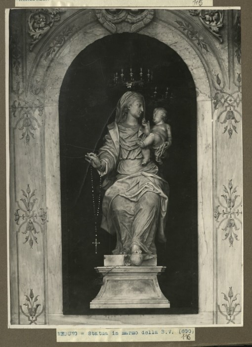 Riproduzione fotografica di una scultura della Madonna con Bambino in marmo all'interno di una nicchia decorata con stucchi e conservata presso la Chiesa di Santa Maria Maggiore a Meduno.