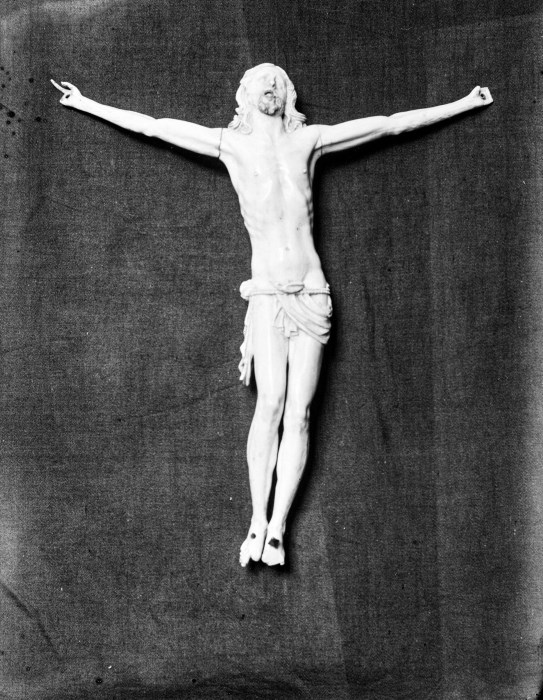 Riproduzione fotografica della scultura in pietra di Gesù Cristo in croce (la croce è mancante) su sfondo nero.