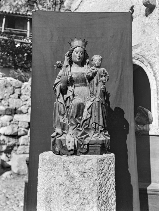 Riproduzione fotografica di una scultura lignea di "Madonna in trono con Bambino" posizionata, per la documentazione fotografica, sopra una colonna in pietra ed uno sfondo scuro di tela, probabilmente all'esterno del Duomo di Venzone. Nell'immagine spunta simpaticamente il volto di un bambino situato dietro la sfondo telato con lo sguardo rivolto alla persona che trattiene la tela per lo scatto fotografico.