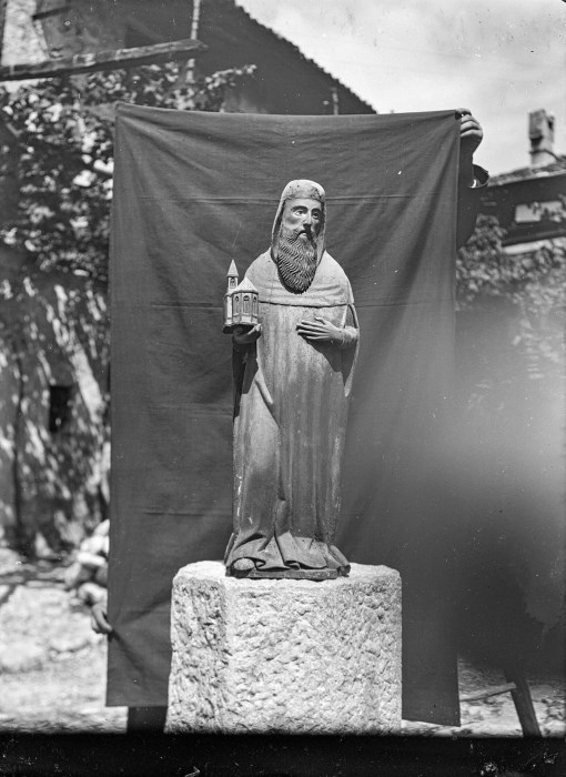 Riproduzione fotografica di una scultura lignea di un Santo con in mano la riproduzione di un edificio religioso, posizionata, per la documentazione fotografica, sopra un piedistallo in pietra ed uno sfondo scuro di tela tenuto dagli assistenti del fotografo, probabilmente all'esterno del Duomo di Venzone.