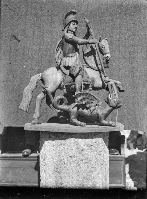 Riproduzione fotografica di una scultura lignea di "San Giorgio mentre uccide il drago", posizionata, per la documentazione fotografica, sopra un piedistallo in pietra ed uno sfondo scuro di tela tenuto dagli assistenti del fotografo, probabilmente all'esterno del Duomo di Venzone.