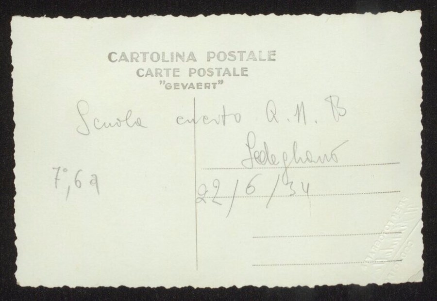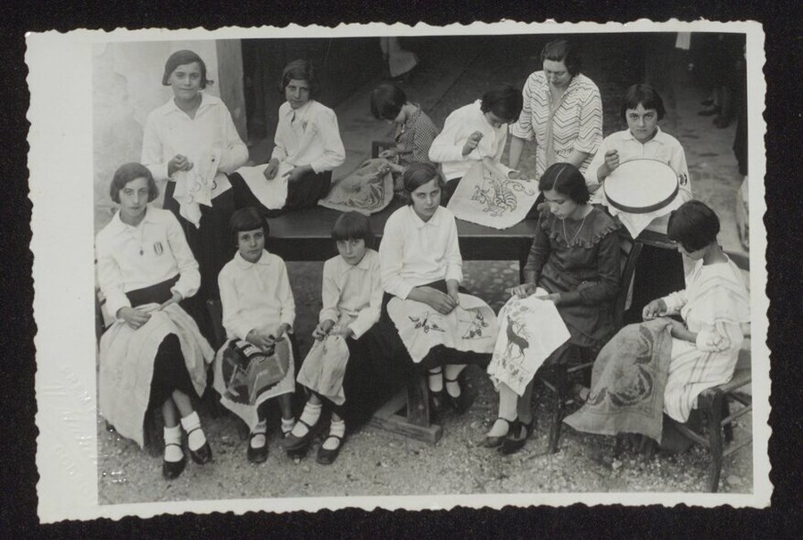 Ritratto di bambine e giovinette sedute davanti e intorno ad un tavolo in legno posto in un'area scoperta, e con in mano lavori di ricamo. La didascalia a lapis sul verso della foto le colloca nella Scuola di cucito dell'Opera Nazionale Balilla di Sedegliano, e data lo scatto al 22 giugno 1934. In piedi, sovrintende una educatrice; quasi tutte le bambine indossano la divisa delle Piccole Italiane, organizzazione fascista alla quale erano obbligatoriamente iscritte le ragazze italiane di età compresa tra gli 8 e i 14 anni.
