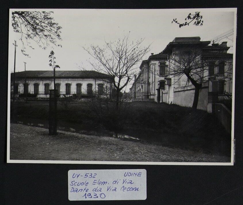 Udine, via Dante: veduta da via Teobaldo Ciconi della scuola elementare al tempo intitolata a Vittorio Emanuele III, ora a Dante Alighieri (1902-1905), edificata nell'ex “Braida Codroipo“.