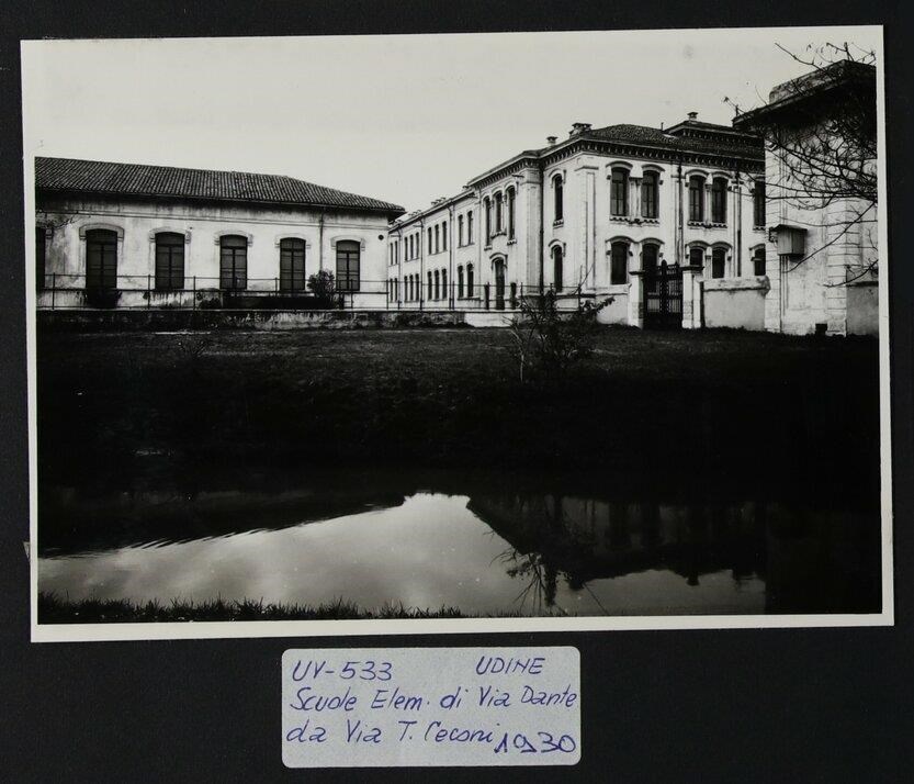 Udine, via Dante: veduta da via Teobaldo Ciconi della scuola elementare al tempo intitolata a Vittorio Emanuele III, ora a Dante Alighieri (1902-1905), edificata nell'ex “Braida Codroipo“. In primo piano, la roggia di Udine.