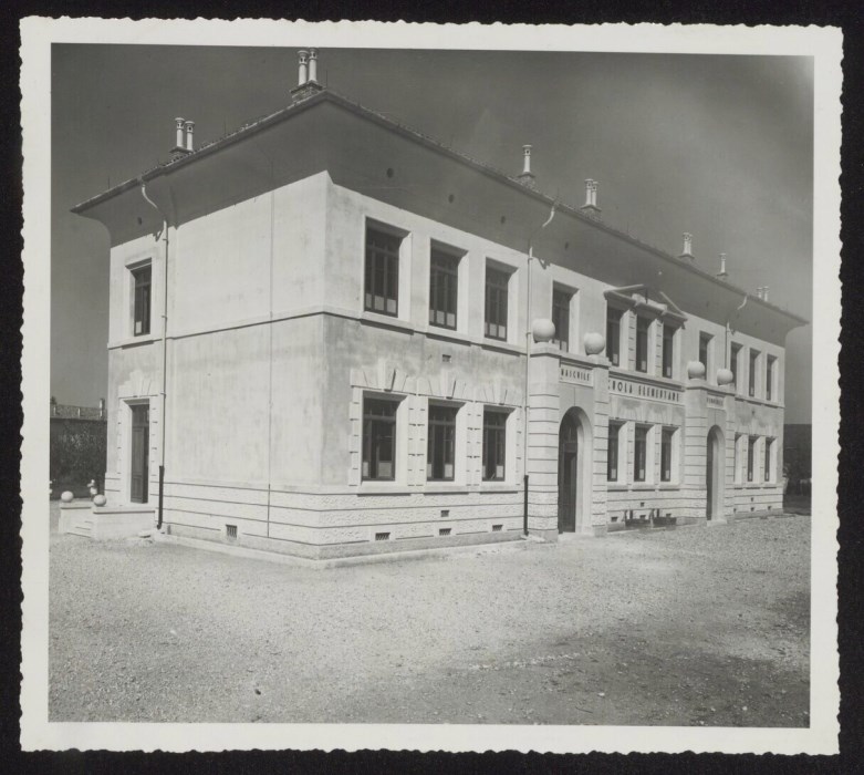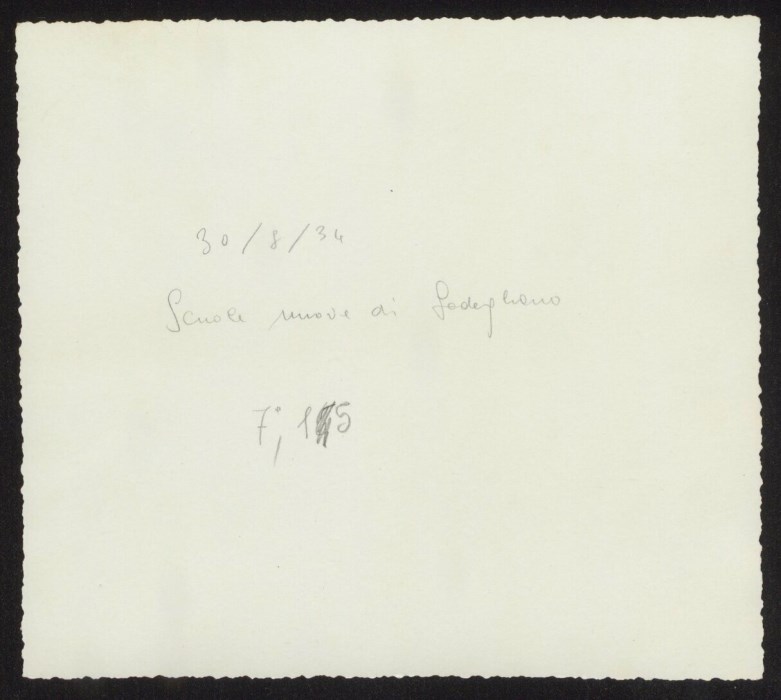 L'edificio della Scuola elementare di Sedegliano, progettata dall'architetto udinese Provino Valle a ridosso del 1930. Si possono notare i due portoni d'accesso, rispettivamente per l'ingresso maschile e per quello femminile. Sul verso dell'immagine, una annotazione a matita identifica il soggetto e data l'immagine al 30 agosto 1934.