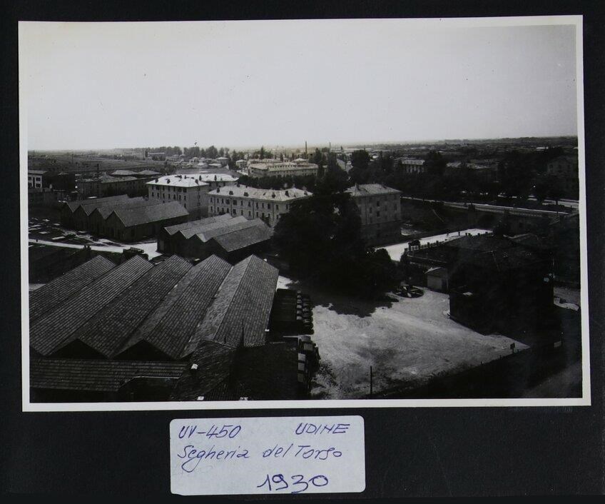 Udine, via Pradamano: deposito di legnami Fratelli Del Torso. In secondo piano a destra, cavalcavia dei SS. Ermacora e Fortunato, iniziato a progettare nel 1896 ma costruito nel 1926 per favorire l'afflusso del traffico.