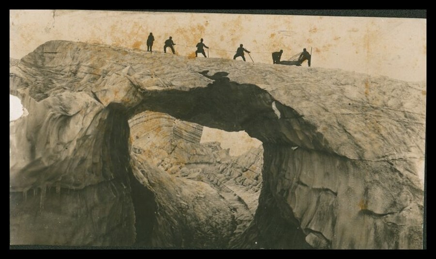 Sei uomini trasportano materiale lungo un ponte di roccia