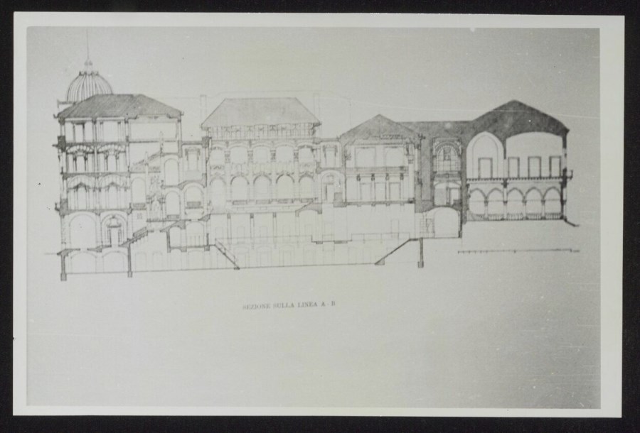 Riproduzione fotografica di una tavola con sezione longitudinale del progetto grafico del palazzo del Municipio di Udine, dai disegni dell'architetto Raimondo D'Aronco. Il palazzo fu progettato nel 1888, finito di costruire nel 1925, e rifinito nei primi anni '30, in stile Liberty.