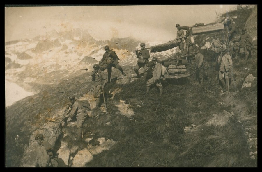 Soldati che trasportano salme di caduti della Grande Guerra