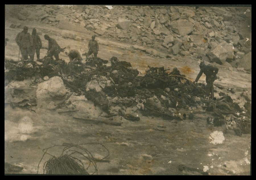 Soldati e gruppo di salme di caduti della Prima Guerra mondiale ammucchiate in zona di combattimento