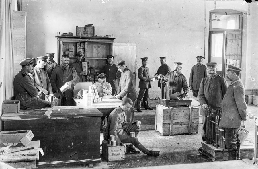 Ritratto di un gruppo di soldati austro-ungarici mentre si riforniscono presso uno spaccio alimentare.
