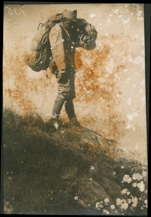 Soldato che trasporta in spalla una salma di caduto della Prima Guerra mondiale, avvolta in teli legati
