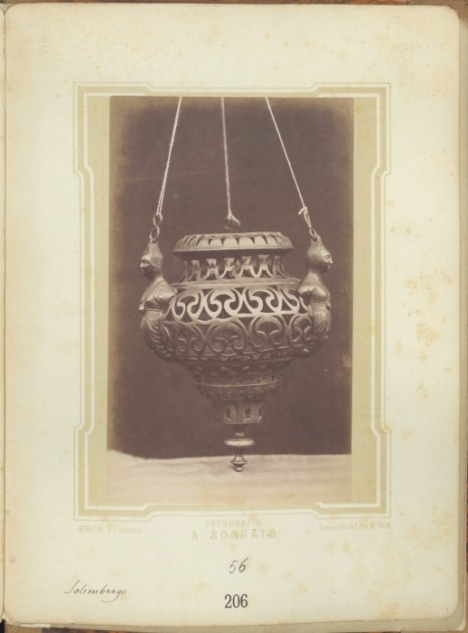 Riproduzione fotografica di un'antica lampada pensile in ottone appartenente alla Chiesa di Solimbergo, frazione di Sequals.