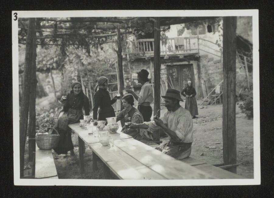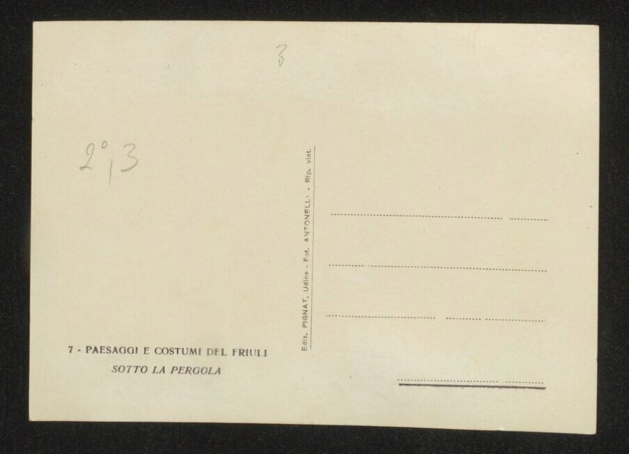 Lo scatto di Umberto Antonelli, farmacista e fotografo attivo in Carnia tra 1909 e 1949, è parte della serie di cartoline pubblicate dal fotografo editore Carlo Pignat con il titolo "Paesaggi e Costumi del Friuli" nella seconda metà degli anni Trenta del Novecento, raffiguranti tutte una Carnia e un Friuli arcadici. L'immagine ritrae un gruppo di persone in costume popolare friulano che conversa e beve allegramente sotto un pergolato. La donna a sinistra seduta sul tavolo, con il bicchiere in mano, è Aurelia Frucco; l'uomo in piedi, con il capello, è Italo Luciano Bearzi.