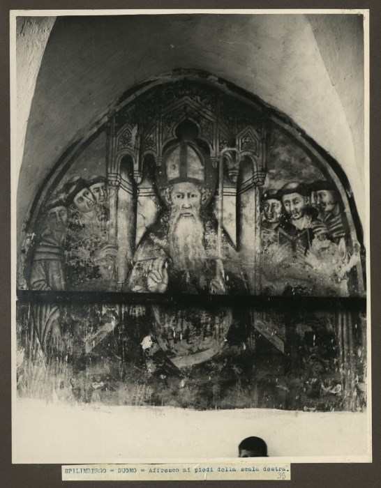 Affresco raffigurante un pontefice attorniato da alcuni frati su di una lunetta ai piedi della scala destra presso il Duomo di Spilimbergo.