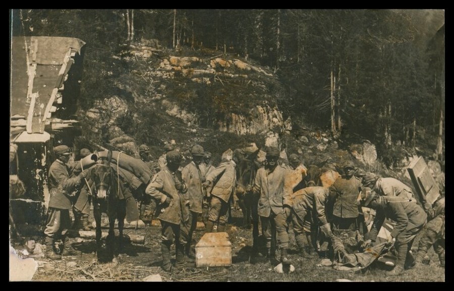 Squadra di militari impegnati nelle operazioni di recupero delle salme dei caduti della Grande Guerra. Un gruppo di soldati, a destra, sta posizionando dei resti in una bara. Due muli, carichi di salme avvolte in tele sono in attesa di essere scaricati.