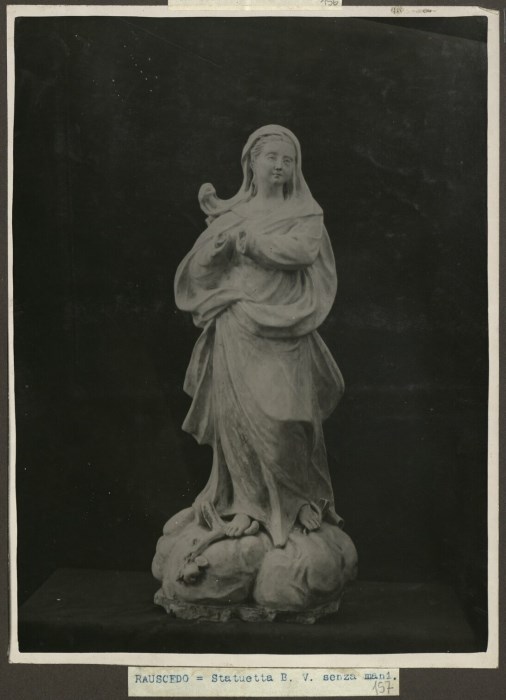 Riproduzione fotografica di una piccola statua della Beata Vergine, priva di mani, sopra una nuvola e conservata presso la Chiesa di Santa Maria e San Giuseppe a Rauscedo di San Giorgio della Richinvelda.