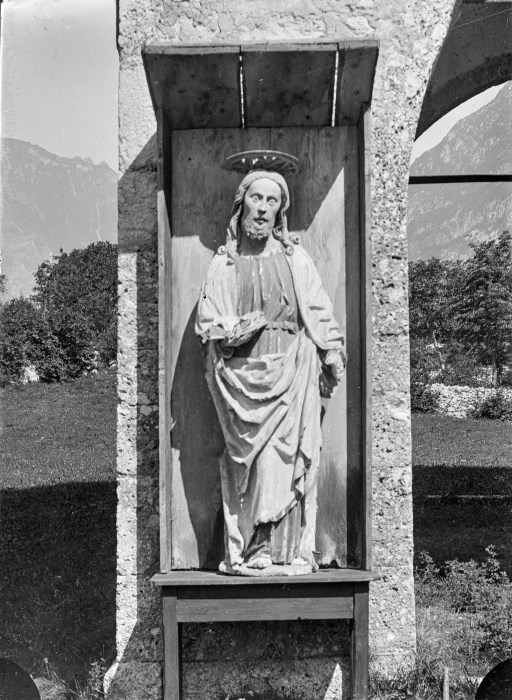 Riproduzione fotografica di una statua di Cristo posizionata su un supporto ligneo all'esterno di una struttura muraria con archi; sullo sfondo una veduta montana, probabilmente nella zona di Venzone.