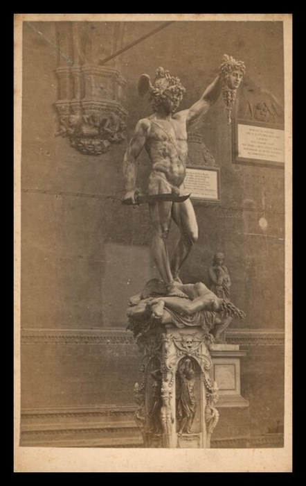 Riproduzione fotografica della scultura del Cellini raffigurante Perseo con la testa di Medusa situata nella Loggia dei Lanzi a Firenze.