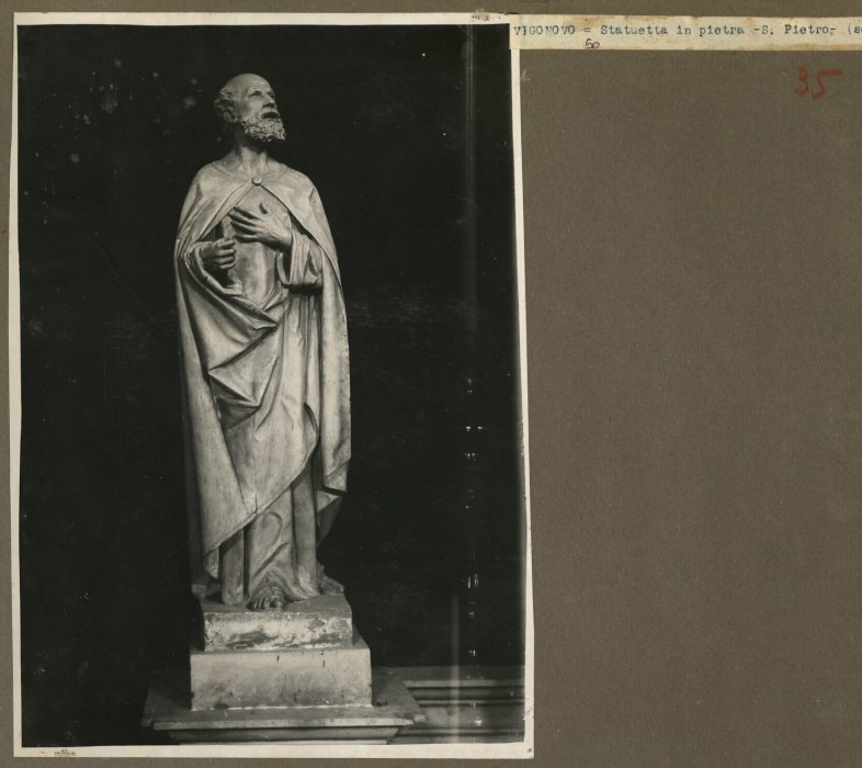 Riproduzione fotografica di una statua in pietra raffigurante San Pietro e conservata presso la Chiesa di Santa Maria Assunta a Vigonovo di Fontanafredda.