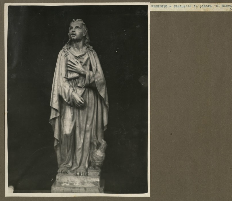 Riproduzione fotografica di una statua in pietra raffigurante San Giovanni e conservata presso la Chiesa di Santa Maria Assunta a Vigonovo di Fontanafredda.