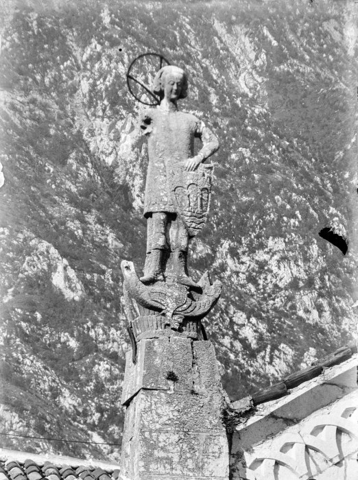 Riproduzione fotografica di una della statue posizionata sui contrafforti esterni del Duomo di Venzone; la statura raffigura San Giorgio mentre uccide il drago.