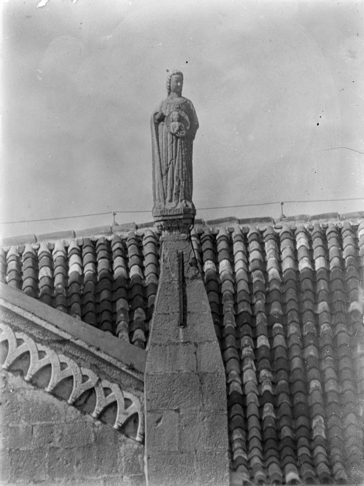 Riproduzione fotografica di una della statue posizionata sui contrafforti esterni del Duomo di Venzone; la statua raffigura un santo con in mano un ritratto.