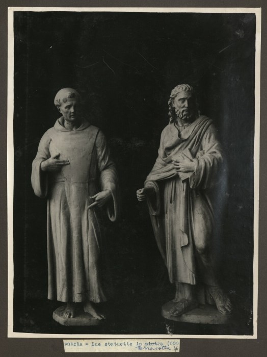 Riproduzione fotografica di due statuette in terracotta raffiguranti dei santi e conservate presso la la Chiesa di San Giorgio Martire di Porcia.