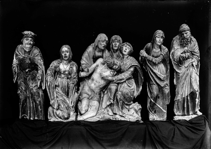 Riproduzione fotografica di statue lignee raffiguranti "La Pietà" e posizione su fondale scuro.