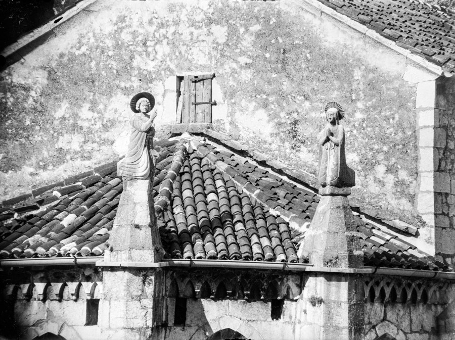 Riproduzione fotografica di due statue posizionate sui contrafforti esterni del Duomo di Venzone; raffigurano due Sante inginocchiate.