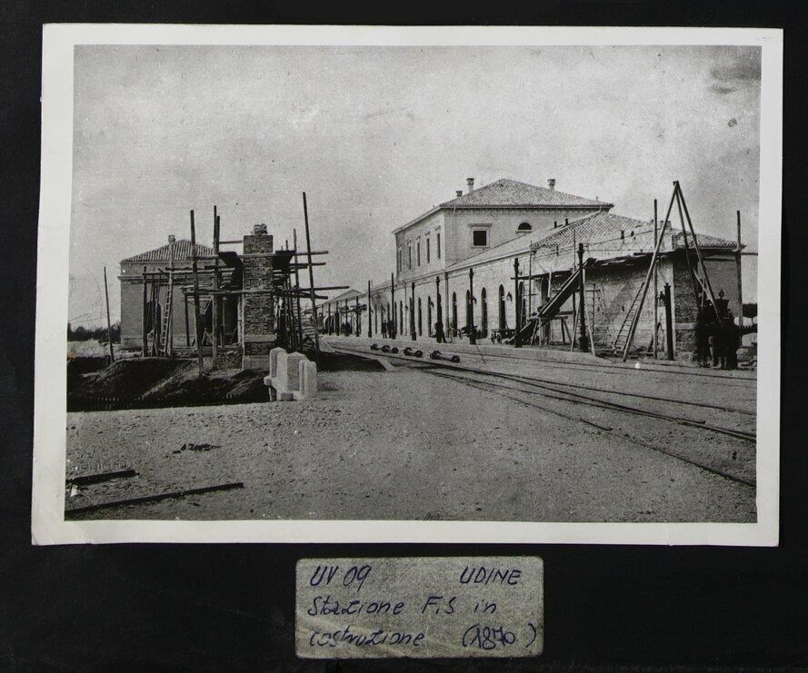Udine, viale della Stazione: stazione ferroviaria in costruzione, verso il suo completamento. All'interno del cantiere sono presenti cinque uomini. Essa è la prima fotografia ufficiale della Stazione. Lo scatto viene commissionato dall'impresa "De Marchi Laschi", che ha costruito la tratta Casarsa-Cormons (ferrovia Veneto-Illirica).
