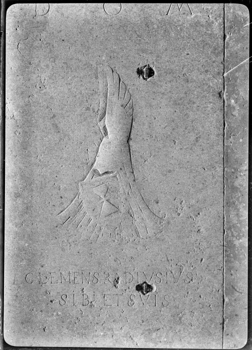 Riproduzione fotografica di un bassorilievo in pietra di uno stemma con un'iscrizione.