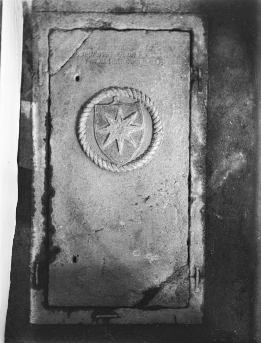 Riproduzione fotografica di un bassorilievo in pietra raffigurante uno stemma con stella ed un iscrizione.
