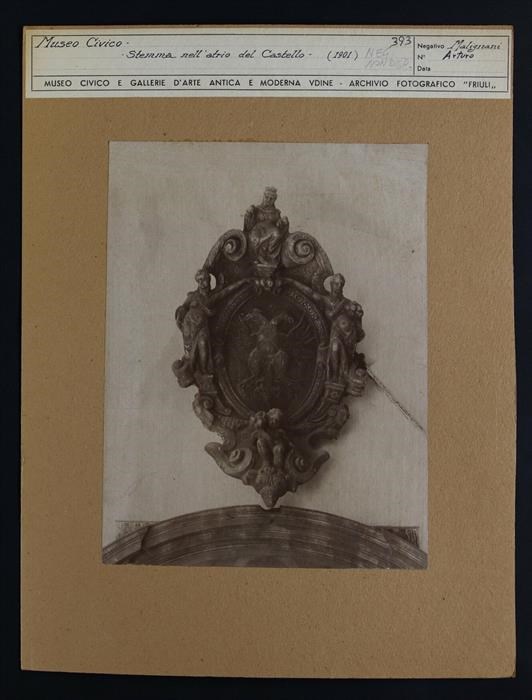 Udine, castello, atrio: stemma di luogotenente veneto al governo, con due grifoni nell'ovale caratterizzato da una cornice mistilinea. Quattro statuette (tre figure femminili, di cui due ingnude, e un satiro) sono disposte attorno all'ovale.