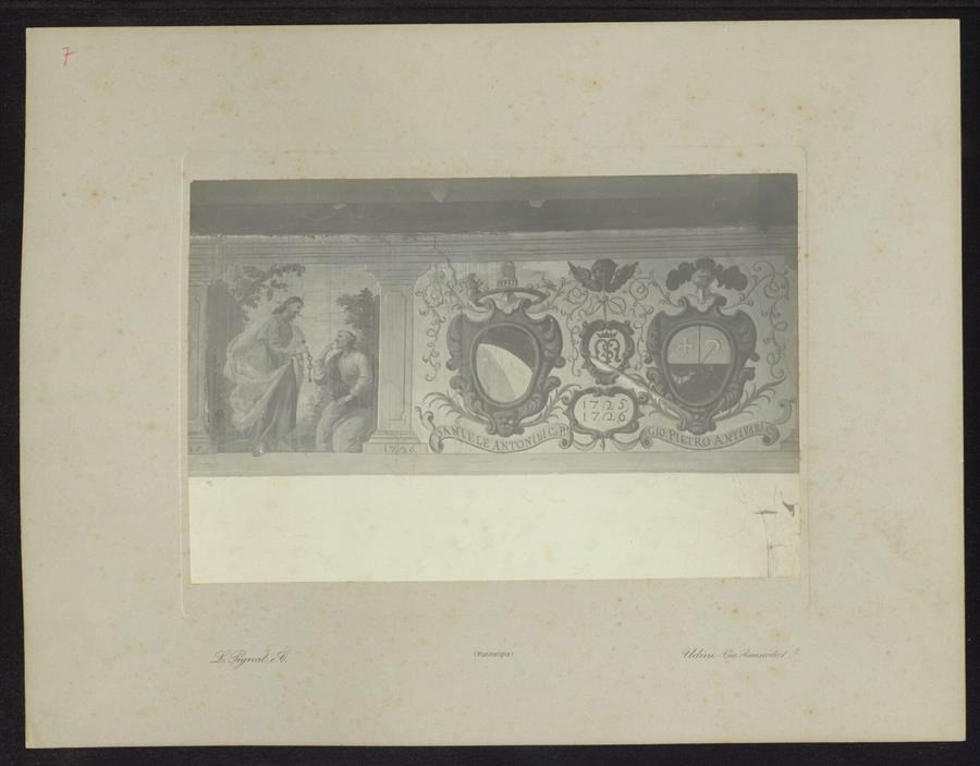 Stemmi delle famiglie nobiliari udinesi associate alla Confraternita dei Battuti ovverosia partecipanti alla realizzazione e mantenimento dell'Ospizio dei Battuti di Santa Maria della Misericordia, ospedale in Udine già nel 1550, situato in via Beato Odorico da Pordenone, ora sede dell'anagrafe comunale. A sinistra l'affresco di Gesù Cristo mentre consegna le chiavi del potere divino e di quello temporale a San Pietro.