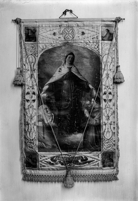 Riproduzione fotografica di uno stendardo raffigurante la "Madonna che copre con il suo manto i fedeli inginocchiati ai suoi piedi".