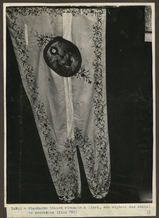 Riproduzione fotografica di uno stendardo bianco con ricami floreali, e dipinti due angeli in adorazione conservato presso la Chiesa di Sant'Anna già Santa Margherita a Tamai di Brugnera.