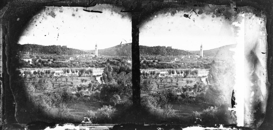 Stereoscopia della veduta di Attimis che sorge accanto ad un torrente in secca. Sulla cima della collina accanto al paese, la Chiesa della Madonna d'aiuto già Chiesa sussidiaria di San Giorgio.