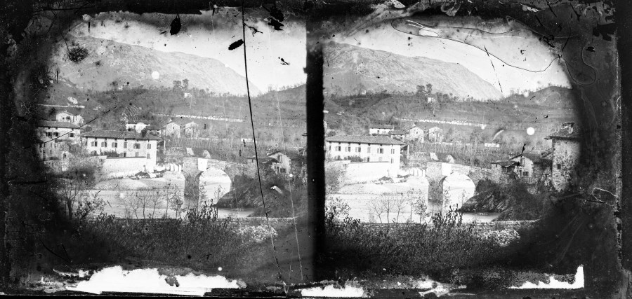 Stereoscopia della veduta di un paese con case e ponte in pietra distrutto attorniati da colline.