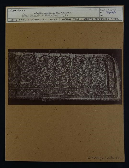 Sequals, Lestans, chiesa di Santa Maria Assunta: stoffa con decorazioni fitomorfe dorate.