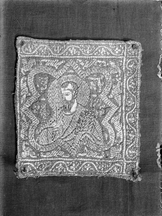 Riproduzione fotografica di una stoffa ricamata e raffigurante un santo, posizionato su un fondale di tessuto scuro per la documentazione fotografica.