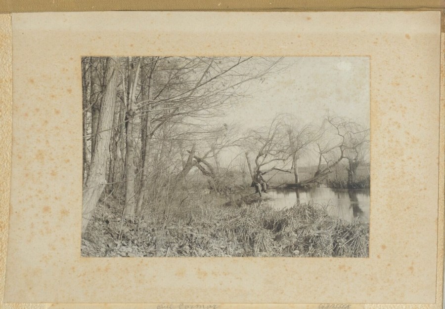 Ritratto di un uomo seduto sul tronco di un albero, la canna da pesca appoggiata al ramo sul torrente Cormor.