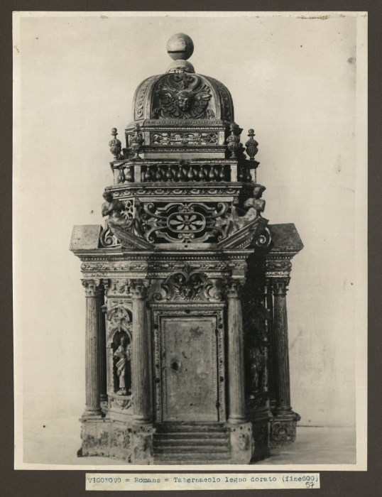 Riproduzione fotografica di un tabernacolo legno dorato databile alla fine del '600 e conservato presso la Chiesa della Beata Vergine del Rosario nel borgo di Romano, nella frazione di Vigonovo di Fontanafredda.